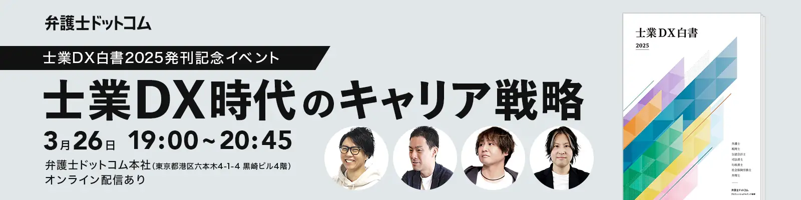 「士業DX白書2025」の発刊を記念して、白書のインタビューなどに出ていただいた4人の士業関係者によるトークセッションを中心としたイベント「士業DX時代のキャリア戦略」を3月26日(水)に開催します。こちらもぜひご参加ください。