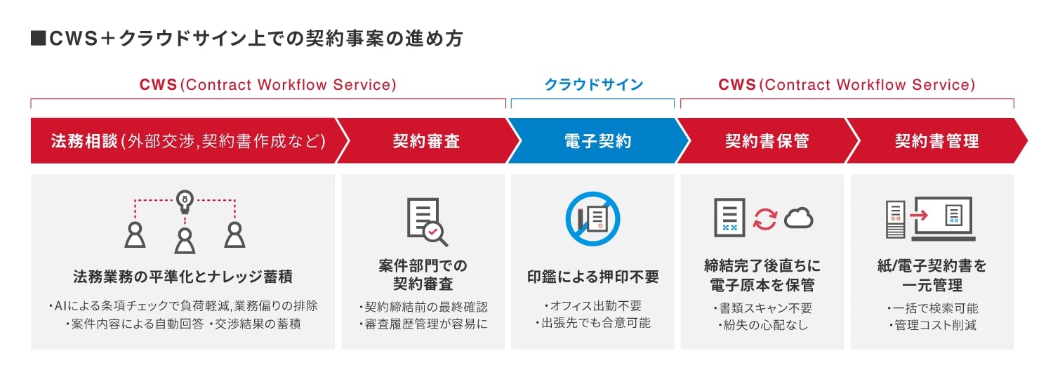 今回の「クラウドサイン連携オプション」では、法務相談と紙文書の契約情報管理に加え、電子締結・電子契約書管理までの法務業務全般の支援が可能となります。押印と契約書の保管・登録のプロセスを電子化することで、出張時や在宅勤務時でもモバイルパソコンやスマートフォンから締結処理が可能になります。また、紙文書をスキャンする手間がなく、締結完了後に電子原本を自動で保管するため、郵送物遺失のリスクやオフィスでの書類管理作業が不要になります。契約業務の大幅な削減や、契約締結のスピード化とコスト削減に貢献します。今後、リコーの契約書業務にも本製品を導入し、社内DXの取り組みを加速します。また、社内実践を通じて得られた知見を製品・サービスの向上に活用していきます。