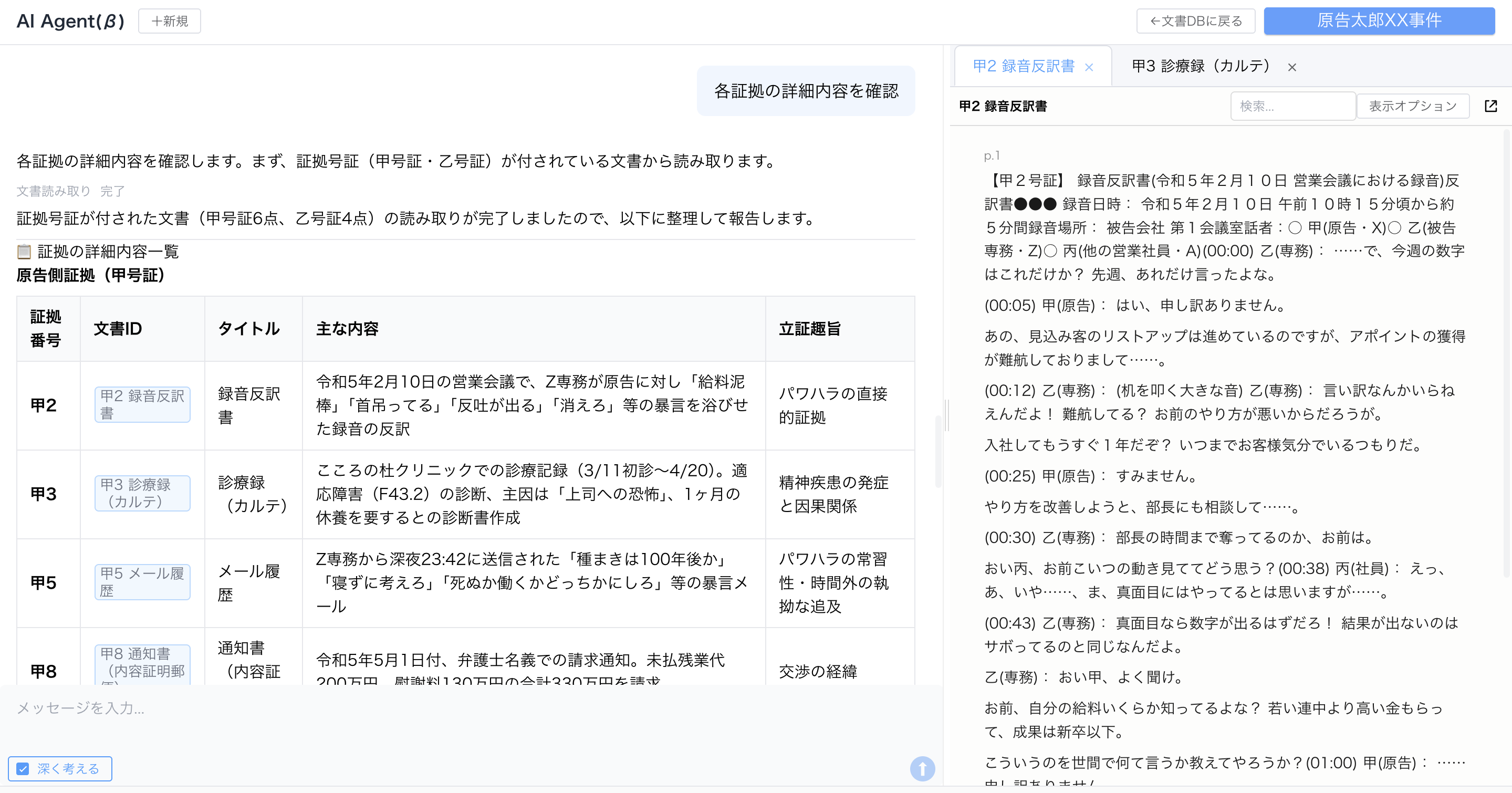 AIが人間の指示を柔軟に解釈し、『弁護革命』に保存された事件記録を自律的に検索、読み取って判断をおこない、応答します。単純な要約、資料探索にとどまらず、争点整理や証拠評価といった業務のコアに属する指示にもパフォーマンスを発揮します。