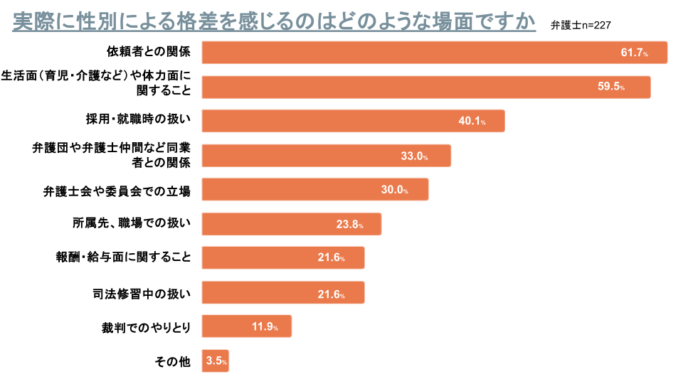 法曹界でジェンダーギャップを感じる人に、実際に格差を感じる場面を尋ねたところ、「依頼者との関係」が61.7%と最も多く、女性弁護士と男性弁護士で依頼者の態度が違うなど、一般の人からはいまだ弁護士=男性と捉えられている実態が見えてきます。