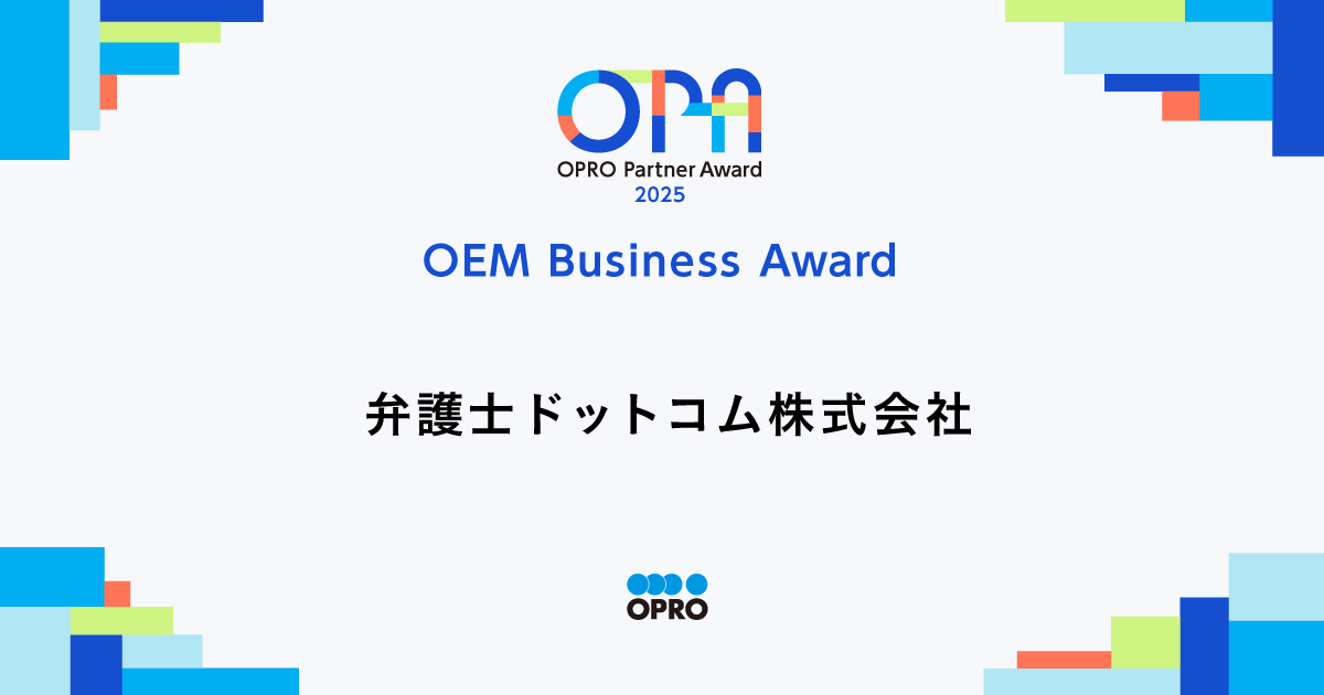 弁護士ドットコム株式会社(東京都港区、代表取締役社長兼CEO・弁護士:元榮 太一郎)は、株式会社オプロ(本社:東京都中央区、代表取締役社長:里見 一典、以下オプロ)が主催する「OPRO Partner Award 2025」において、「OEM Business」を受賞したことをお知らせします。