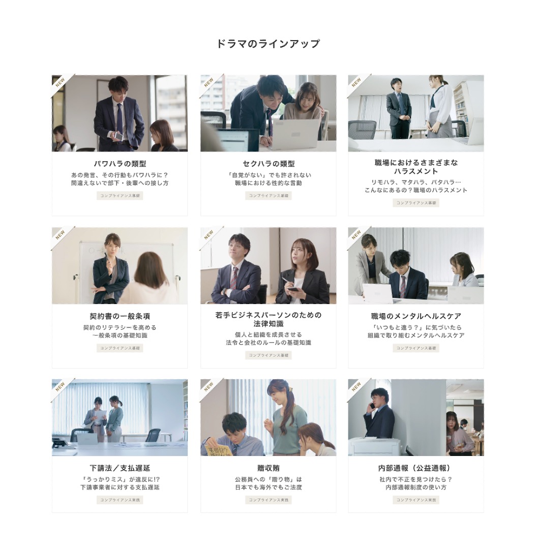 今回のドラマで身につくコンプライアンス第3弾は、コンプライアンス研修の実施に課題を抱える企業の声を受け、「パワハラの類型」「セクハラの類型」「リモハラ、マタハラ、パタハラなど職場で問題となることが多いハラスメントの問題」「契約書の条項」「若手ビジネスパーソンのための法律知識」「贈収賄」「下請法/支払遅延」「内部通報(公益通報)」「職場のメンタルヘルスケア」の9テーマを新たに製作しました。
