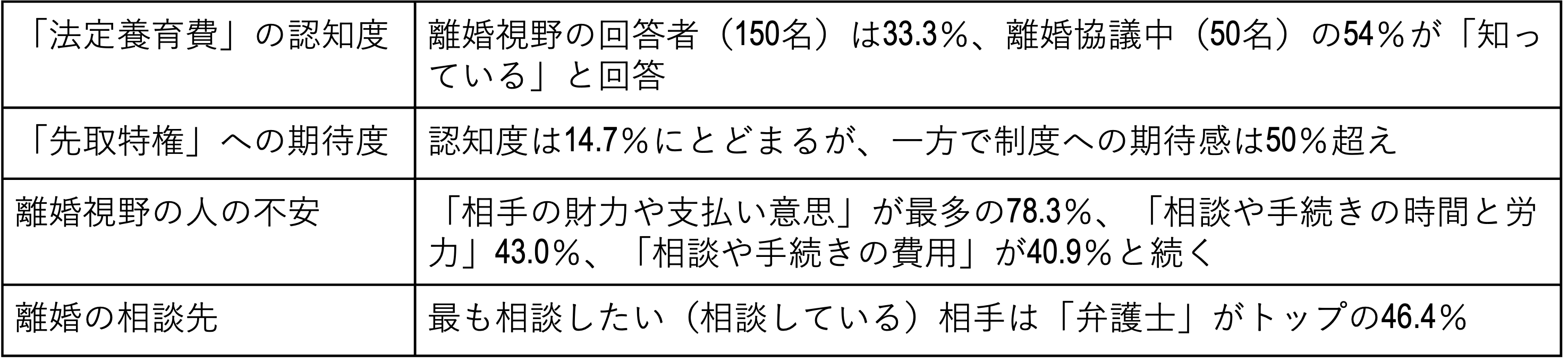 父母の離婚後の養育費についてのルールが変わります。現在、養育費の未払いや不払いで生活が困窮する家庭が問題になっていますが、この新制度により、こどもの利益を確保することや、親の責務が明確になることが期待されます。離婚時に取り決めがなくても子ども1人当たり月額2万円を請求できる「法定養育費」や、養育費を優先的に差し押さえることのできる「先取特権」(上限子ども1人当たり月額8万円)が導入されます。今回、改正民法施行の2026年4月を前に、制度を利用する可能性の高い層(離婚協議中の人・離婚検討中の人)を中心に意識調査を行いました。