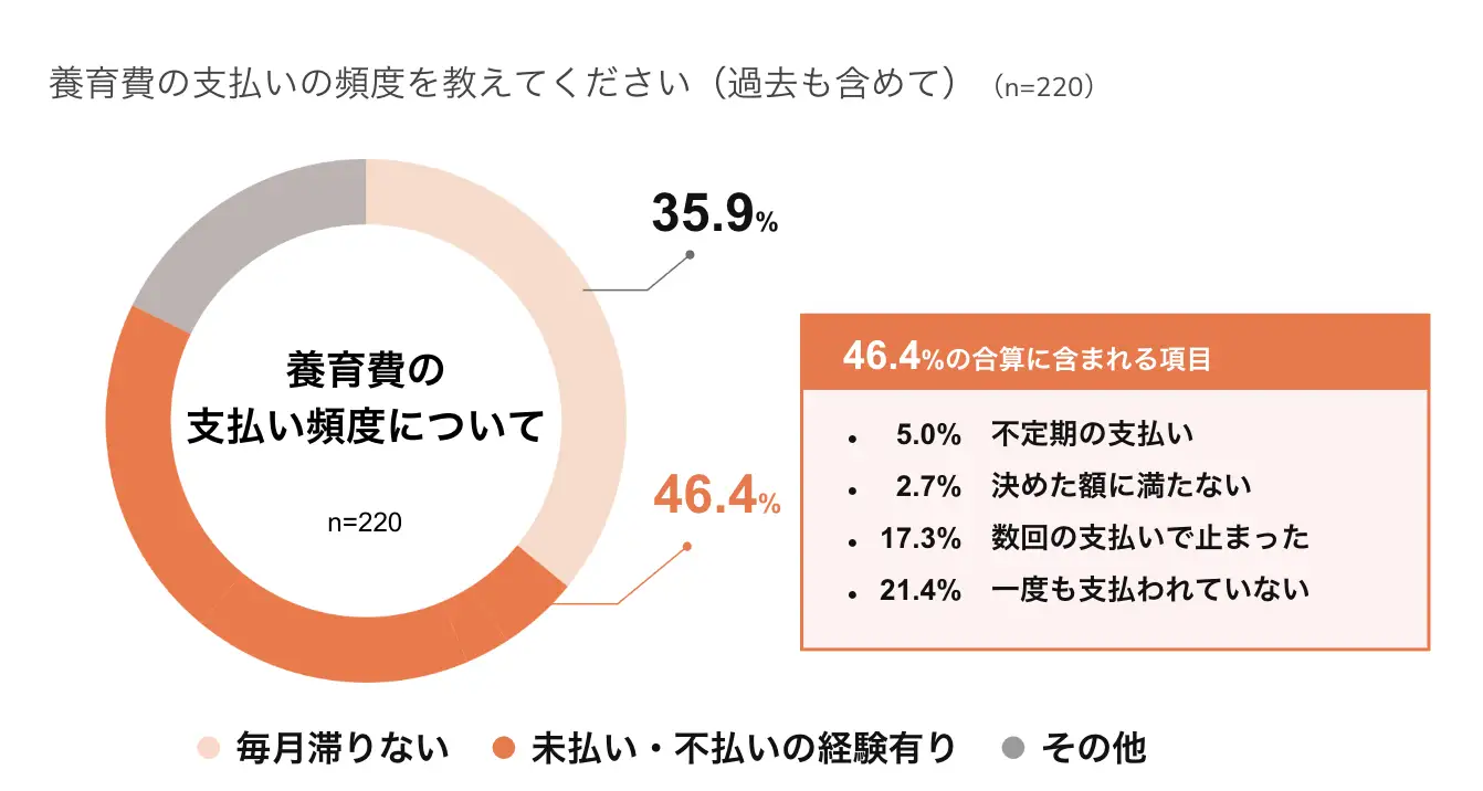 養育費を受け取っている、受け取っていた経験がある離婚経験者(220名)に養育費の支払い頻度について尋ねたところ、46.4%(102名)が養育費の未払いや不払いの経験があったことがわかりました。