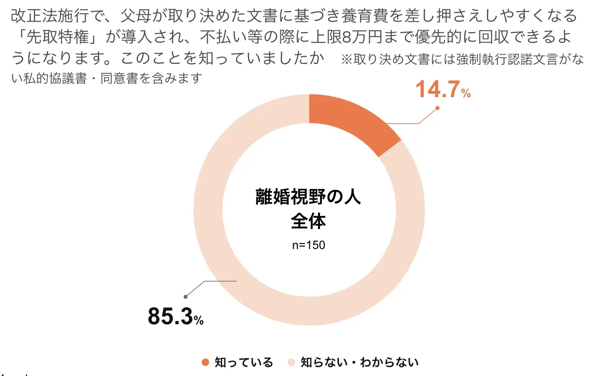 離婚視野の回答者(150名)に、子ども1人あたり月額上限8万円まで差し押さえがしやすくなる「先取特権」についても尋ねたところ、法定養育費に比べて、認知度はさらに低く、14.7%しかありませんでした。実際に離婚協議中の人(50名)でも24.0%と、4分の1に満たず「専門用語がわかりにくい」などの声がありました。