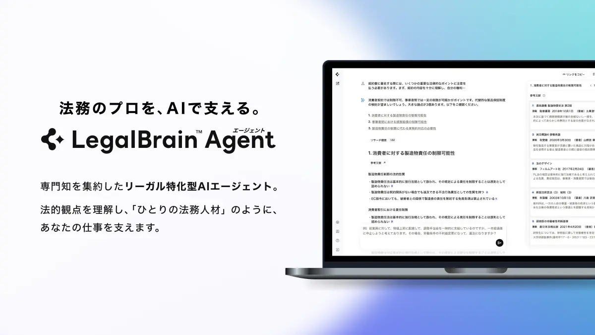当社が独自開発した法律特化AI基盤技術「Legal Brain」を搭載したリーガル特化型AIエージェントです。自然言語入力によりユーザーの調査意図を理解し、根拠となる出典(※1)のリンクを明示した上で、法的論点を自動抽出し、箇条書きでわかりやすく構造的に示します。これにより、複雑で膨大な時間や手間がかかっていたリサーチ業務を大幅に短縮し、弁護士や法務部員などを始めとする専門家が、より付加価値の高い業務に専念できる環境づくりに寄与します。