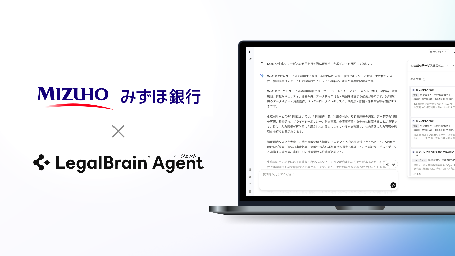 弁護士ドットコム株式会社(東京都港区、代表取締役社長 兼 CEO・弁護士:元榮 太一郎)は、株式会社みずほ銀行(東京都千代田区、頭取:加藤 勝彦、以下みずほ銀行)に、リーガル領域に特化したAIエージェント「Legal Brainエージェント」を提供開始したことをお知らせします。