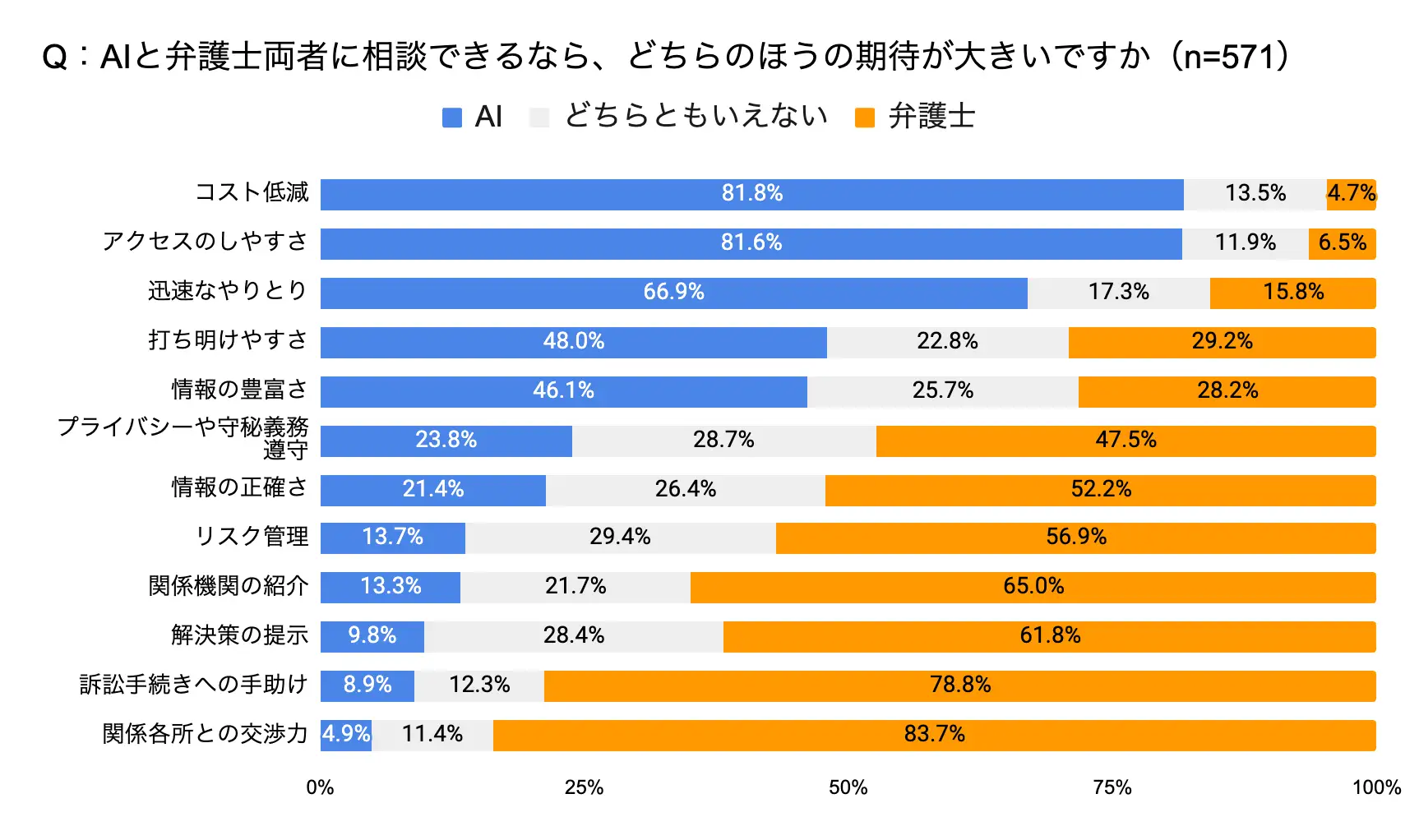 <AIへの法律相談についての意識調査> AI法律相談、「打ち明けやすさ」で弁護士を上回る 「交渉力」などで弁護士に期待する声も