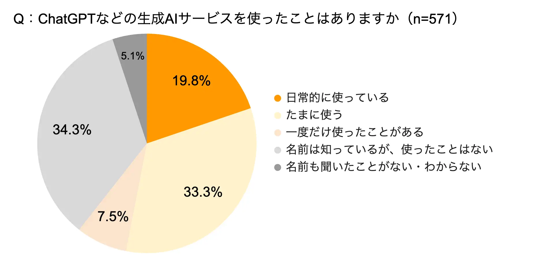 生成AIサービスの利用経験について尋ねたところ、「たまに使う」が33.3%で、「日常的に使っている」(19.8%)、「一度だけ使ったことがある」(7.5%)となり、合計で6割超が利用経験があることがわかりました。