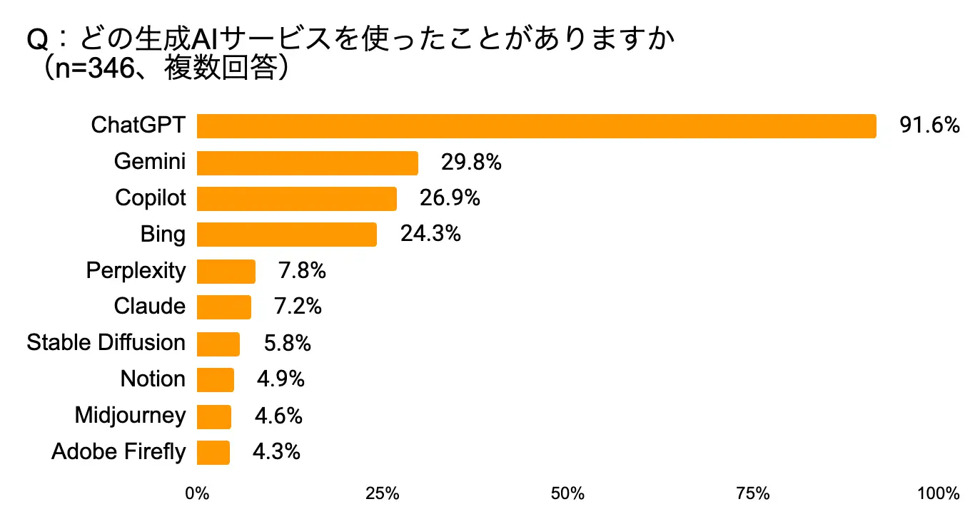 また、使ったことのある生成AIサービスは、ChatGPTが91.6%で圧倒的な高さでした。