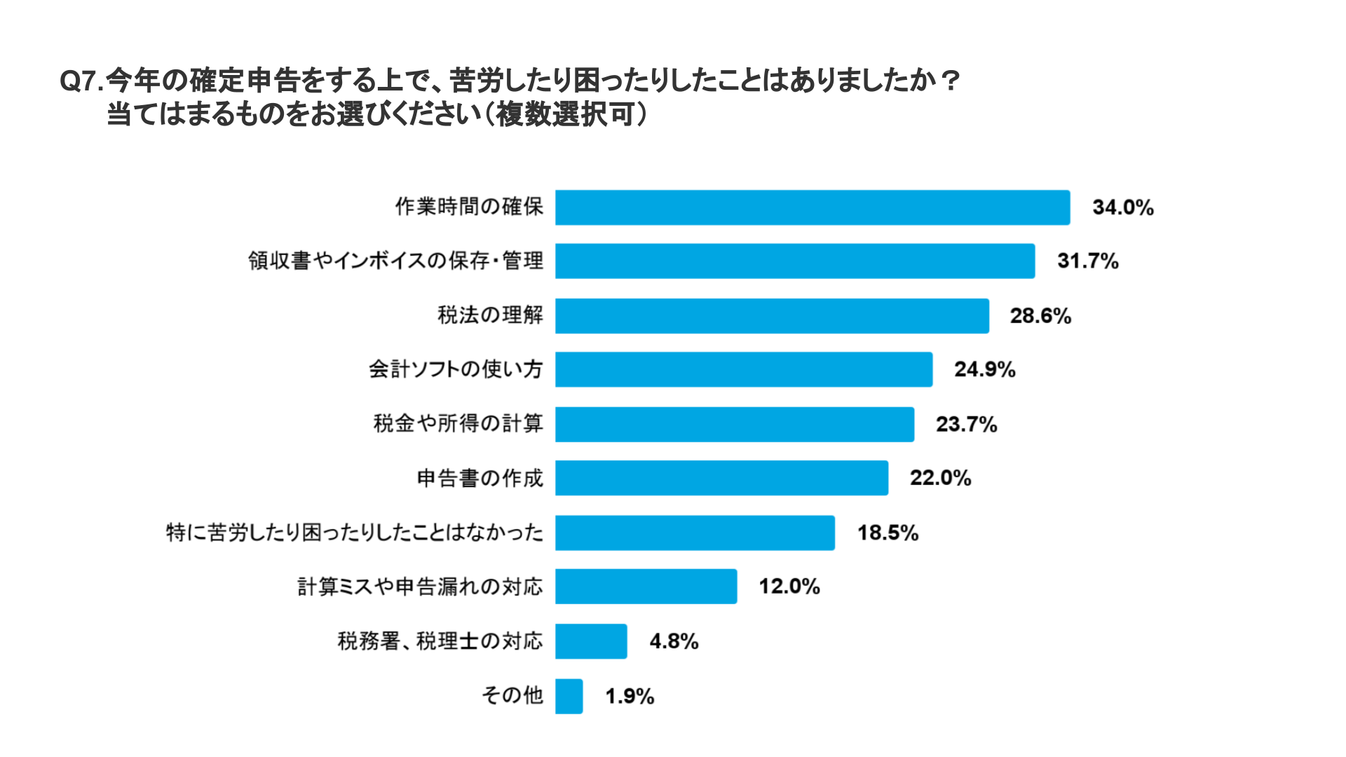 確定申告をする上での苦労や困りごとについての問いでは、34%が「作業時間の確保」でトップに。次いで31.7%が「領収書やインボイスの保存・保管」に、28.6%が「税法の理解」、24.9%が「会計ソフトの使い方」となった。昨年のアンケートでは、「特に苦労したり困ったりしたことはなかった」と回答した人が3割近くいたが、今年は約18%に減少した。これは、インボイス制度の施行により、インボイスの保存や管理の手間が新たな作業として発生したことが要因だと考えられる。