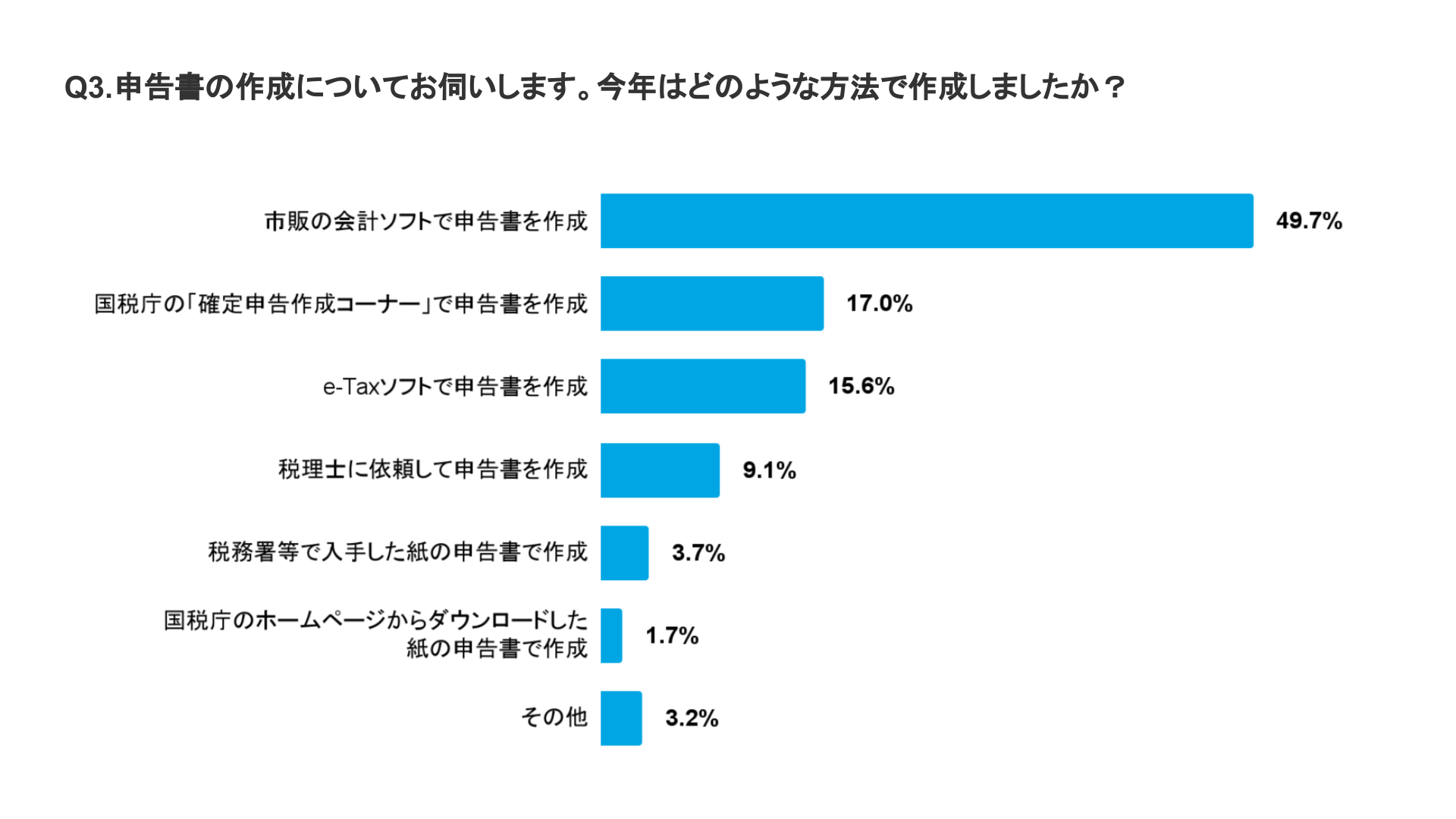 申請書の作成方法についての問いでは、「市販の会計ソフトで申請書を作成」が49.7%でトップとなり、次いで、「国税庁の確定申告コーナーで作成」17.0%、「e-Taxソフトで申告書を作成」15.6%という結果であった。今年も国税庁の申請書作成システム(e-Tax)を利用した割合は市販の会計ソフト利用率に届かず、普及は足踏み状態だと言える。また、「税理士に依頼して申告書を作成」した割合は9.1%となり、昨年の13.7%よりも低下しています。一方で、「市販の会計ソフトを使用して自分で作成する」という割合は41.8%から約8%増加しており、自分自身で確定申告を行う需要が増加していることが明らかになりました。