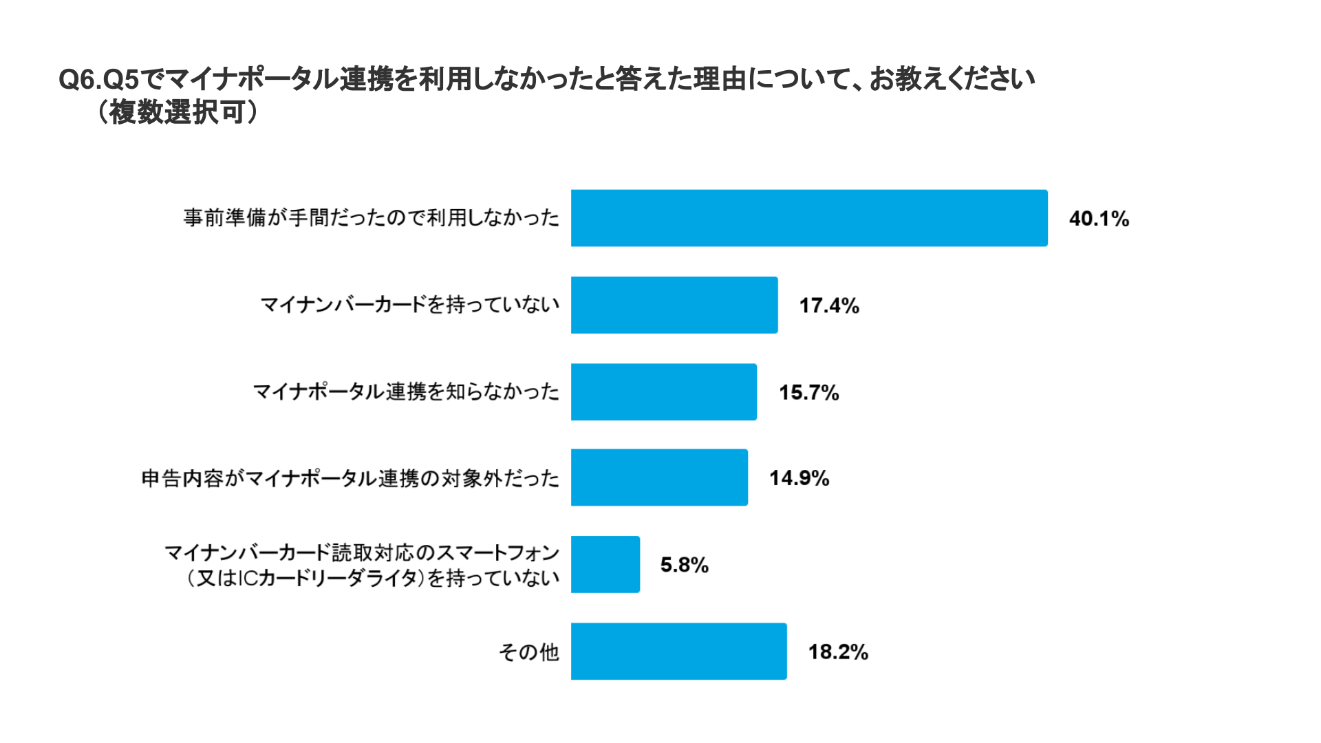「利用しなかった」理由については、40.1%が「事前準備が手間だった」、17.4%が「マイナンバーカードを持っていない」、15.7%が「マイナポータル連携を知らなかった」、14.9%が「申請内容がマイナポータル連携の対象外だった」と回答。事前準備の手間でマイナポータルの申請を約半数が利用をしなかったが、利用しなかった理由を鑑みると、連携の事前準備の簡素化やマイナンバーカードの普及率向上などの影響により利用率は増加すると考えられる。