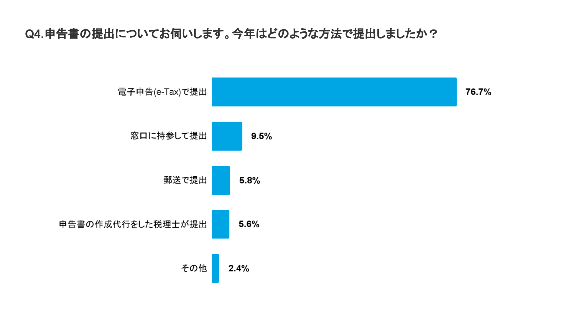 申請書の提出方法では、76.7%が「電子申告(e-Tax)」を利用したと回答。昨年のアンケートでも7割強が税務署に行くことなく自宅から手軽に提出できる”e-Tax”を利用したという結果となっており、確定申告の電子化が浸透していることが明らかになった。