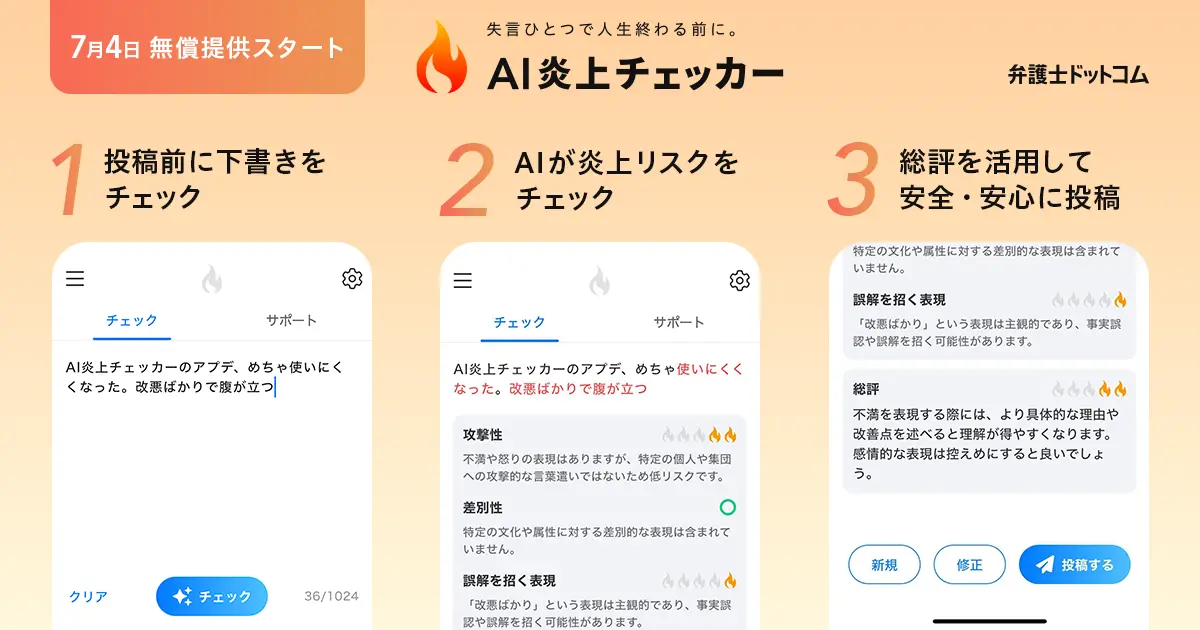 弁護士ドットコム株式会社(東京都港区、代表取締役社長 兼 CEO・弁護士:元榮 太一郎、以下当社)は、SNSなどをはじめとするインターネットサービス上での誹謗中傷や炎上を未然に防ぐリスクチェックツール「AI 炎上チェッカー」の提供を開始することをお知らせいたします。なお「AI 炎上チェッカー」は7月4日よりApp Store、Google Playにて無料配信いたします。