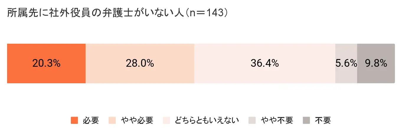 社外役員の弁護士がいる回答者のほうが「必要」と感じる度合いが高いことから、実際に起用している企業では、社外役員の弁護士への満足度が高いことが推測されます。