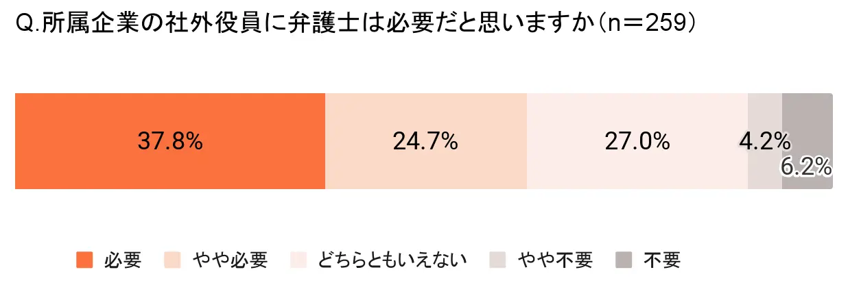 法務パーソンに『所属企業の社外役員に弁護士が必要か』を尋ねたところ、62.5%が「必要」(「必要」「やや必要」の合計、以下同様)」と回答しました。