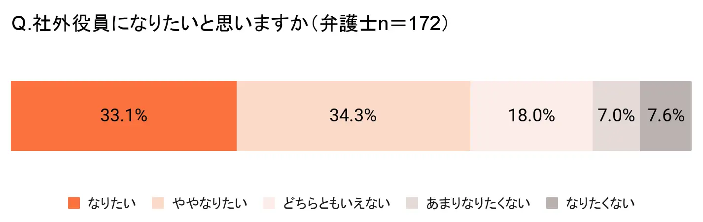 社外役員を経験したことがない弁護士172名に対して『社外役員になりたいか』を尋ねたところ、過半数の67.4%が「なりたい」(「なりたい」「ややなりたい」の合計)と回答しました。弁護士も社外役員に魅力を感じていることがうかがえます。