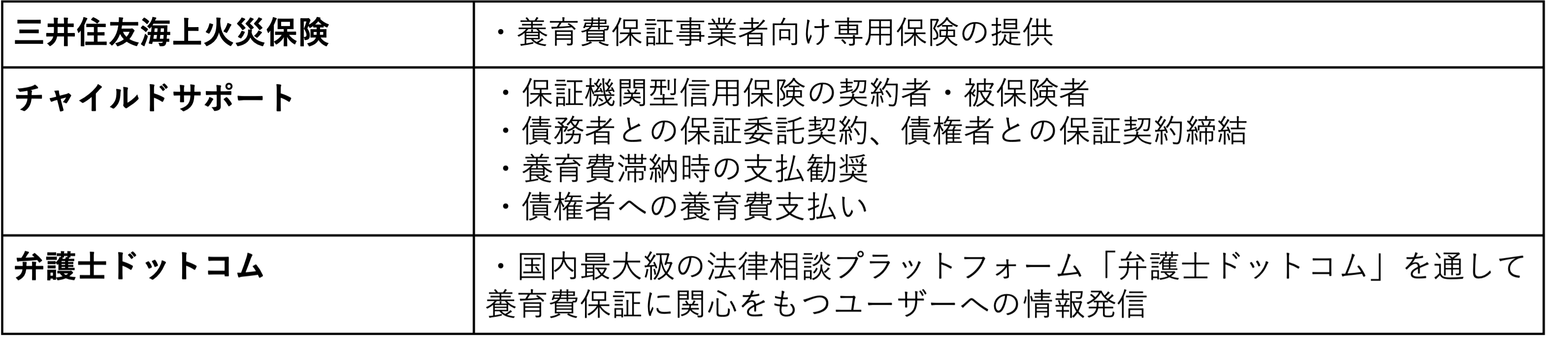 「安心サイクル養育費保証」は、チャイルドサポートが協議離婚の法的支援(離婚ADR)や養育費保証を提供、三井住友海上火災保険が養育費支払い滞りの際にチャイルドサポートが保証履行することで生じた損害の一部を補償、弁護士ドットコムが自社プラットフォームを通じて情報発信と離婚当事者と本サービスを繋ぐことを担う、3社連携の新しいサービスです。.png)