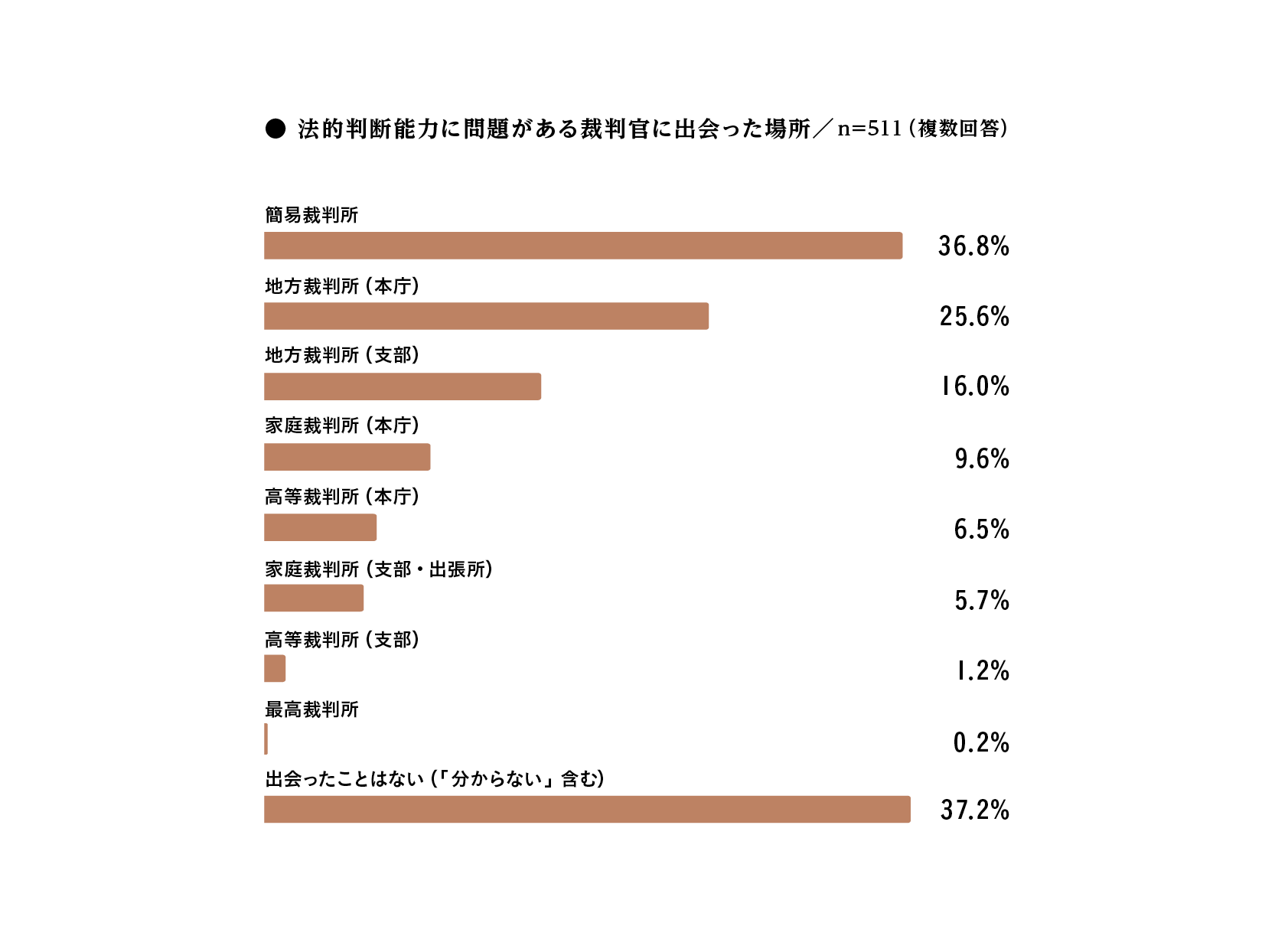 出会った場所は「地方裁判所(本庁)」が43.1%で最多となり、次いで「簡易裁判所」が35.6%、「地方裁判所(支部)」が23.3%となり、下級審に集中した。