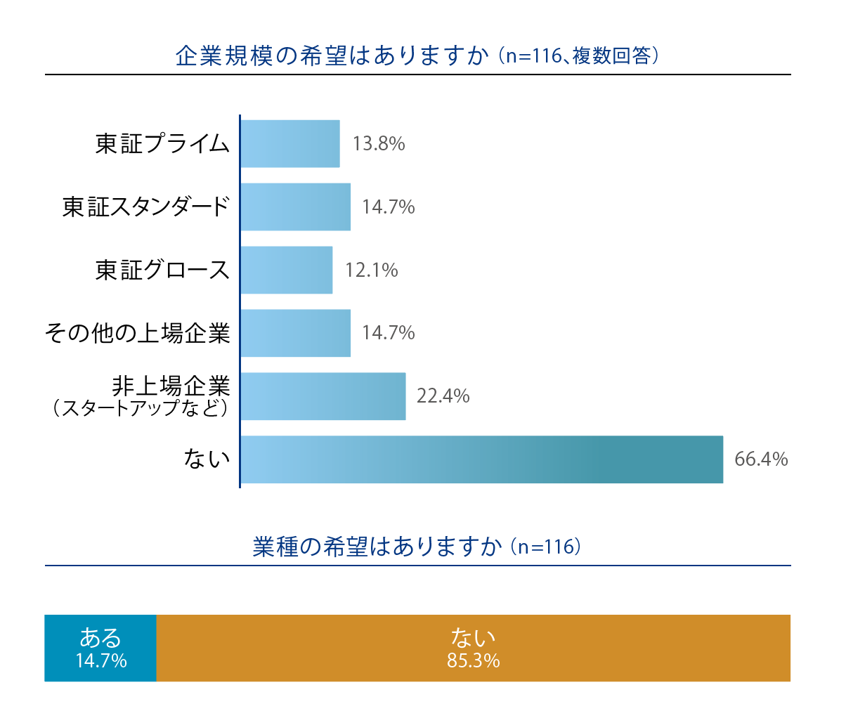 社外役員になりたいと答えた116人に企業規模や業種の希望を聞いたところ、「ない」の割合が企業規模で66.4%、業種で85.3%といずれも過半数を超えた。こちらの結果からも「なれればなりたい」程度で強い希望がないことをうかがわせる。