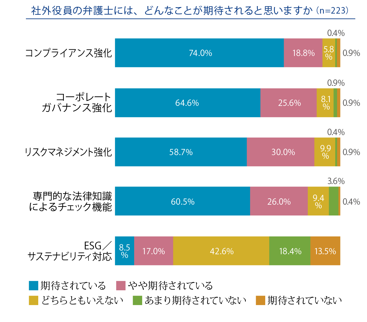 社外役員にどんな役割が求められるかを尋ねたところ、「コンプライアンス」「コーポレートガバナンス」「リスクマネジメント」「専門的な法律知識」の4項目では「期待されている」と「やや期待されている」の合計が9割前後となった。