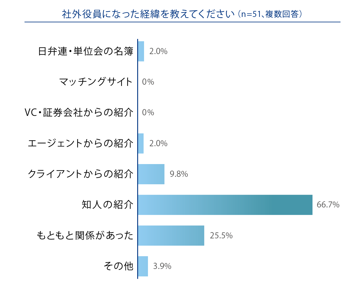 社外役員になった経緯を聞いたところ、「知人の紹介」が66.7%と圧倒的に多かった。以下、「もともと関係があった(25.5%)」、「クライアントからの紹介(9.8%)」と続く。