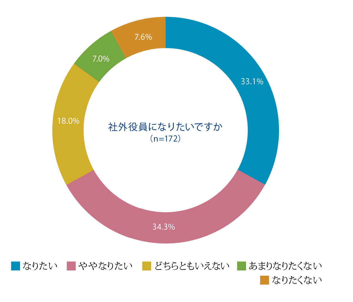 未経験者172人に社外役員になってみたいかを尋ねたところ、「なりたい(33.1%)」と「ややなりたい(34.3%)」が合計で67.4%となった。