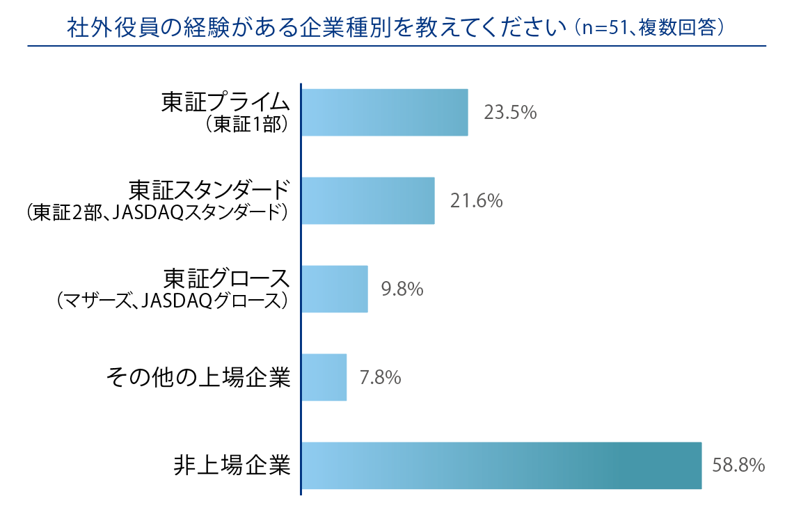 経験者51人が選任された会社を規模別で見ると、「非上場企業」が58.8%で突出した。以下、「東証プライム(23.5%)」、「同スタンダード(21.6%)」、「同グロース(9.8%)」などと続く。