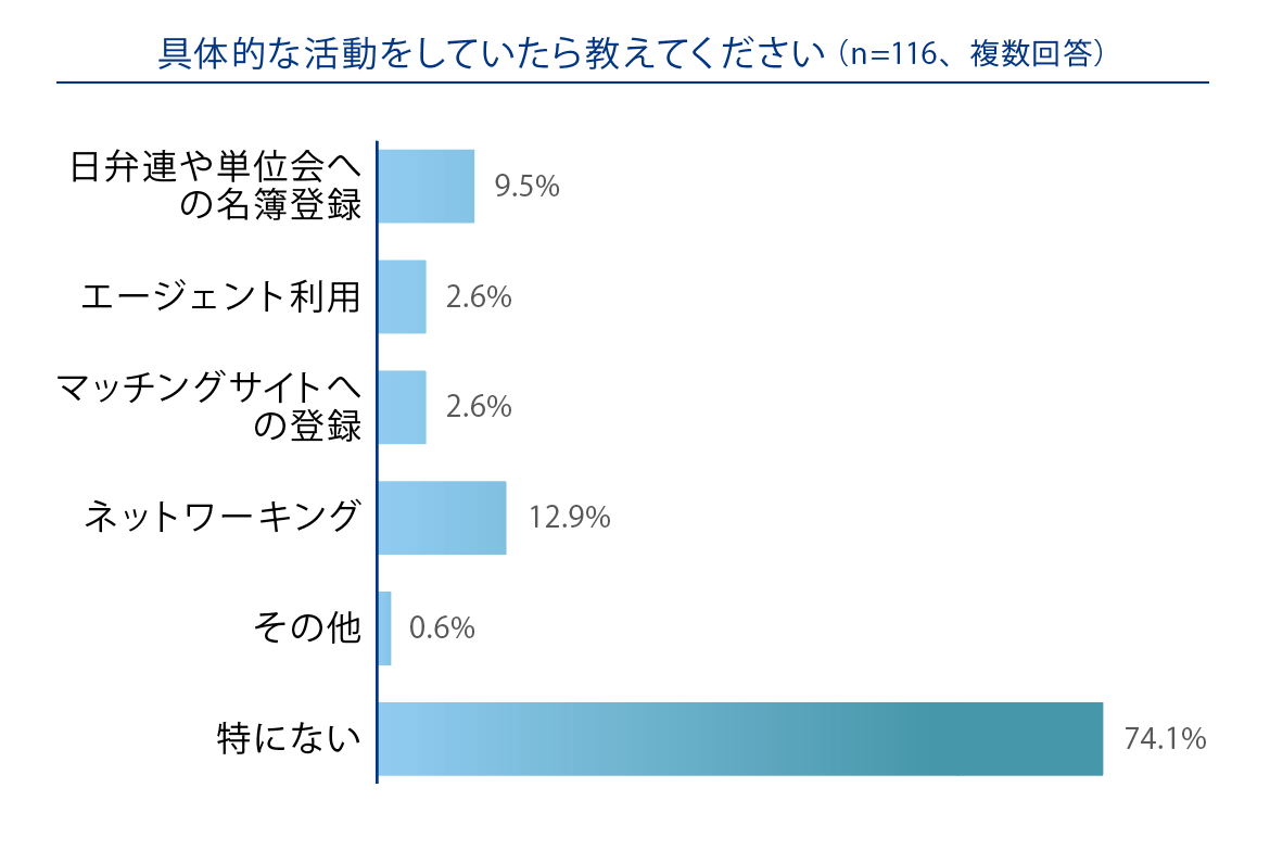 具体的な活動としてあげられたのは、企業経営者との交流を増やすなどの「ネットワーキング(12.9%)」や「名簿登録(9.5%)」。マッチングサイトやエージェントの利用はいずれも2.6%と少数だった。裏返すと本気度が高い場合は、他の希望者に差をつけられる可能性がある。