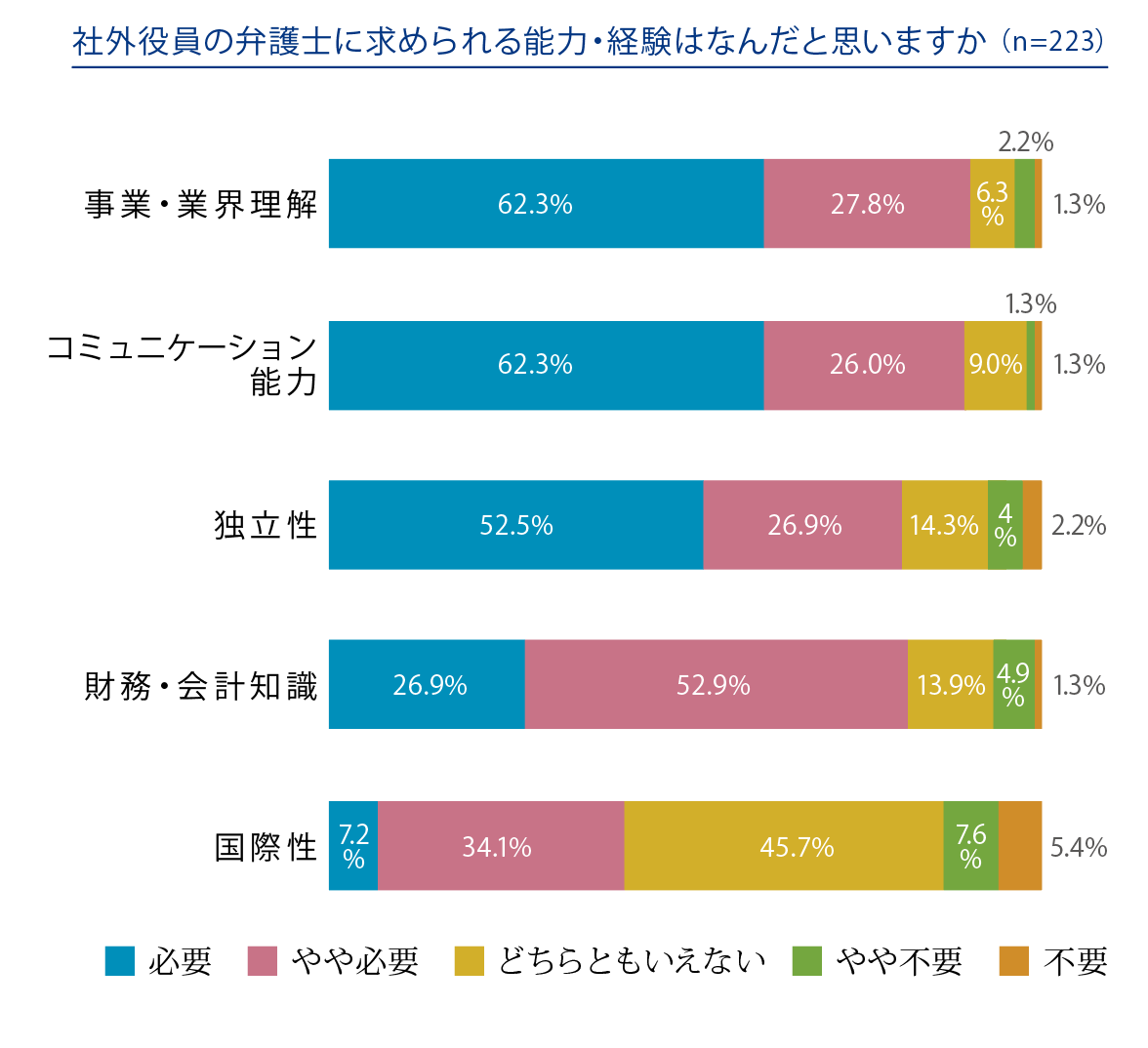 社外役員に求められる能力・経験を尋ねたところ、「必要」「やや必要」の合計値は、「事業・業界理解(90.1%)」、「コミュニケーション能力(88.3%)」、「財務・会計知識(79.8%)」、「独立性(79.4%)」、「国際性(41.3%)」の順で多かった。