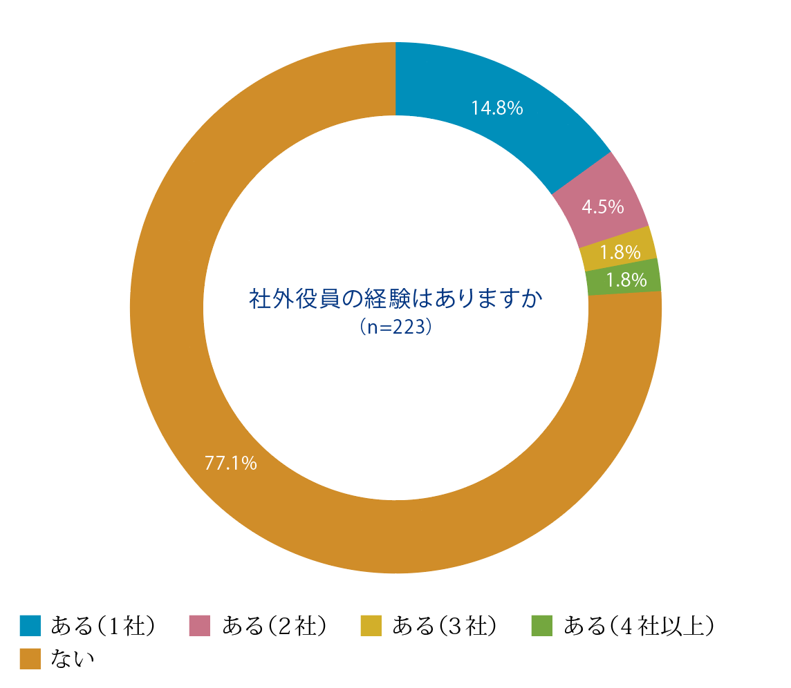 社外役員の経験は「ある」が計22.9%、「ない」が77.1%。「ある」の中では大多数が「1社」だった。