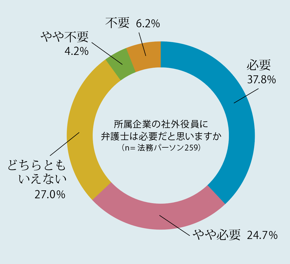 社外役員に弁護士は必要かを尋ねたところ、「必要(37.8%)」と「やや必要(24.7%)」が計62.5%と過半数を占めた。「リスク感度が高く保てる」、「第三者的な立場からの法的視点が期待できる」、「一定の思考力が保証されている」などの意見があった。