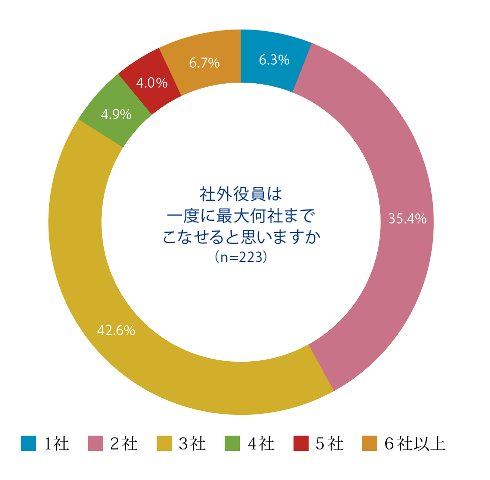 社外役員について語る上での頻出テーマの1つが「何社まで兼務できるか」。弁護士の回答でもっとも多かったのは「3社(42.6%)」で、次点が「2社(35.4%)」だった。「1社」が6.3%であることを考えると、兼務自体は可能だが、その数には限りがあると考える弁護士が多いようだ。