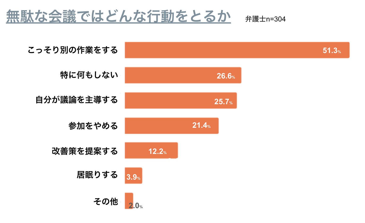 自分が参加する会議中に無駄だと感じることを尋ねたところ(複数回答可)、「長時間の会議」が73.4%、「議題が不明瞭」が52.6%、「会議の目的とは異なる雑談」が31.3%と決め事を無視して進められることに対する内容が上位を占めました。続いて、「意思決定しない」が28.6%、「別の方法(メールや社内ポータル等)で既に伝えている事項を改めて共有する」が23.4%、「不要な人員が多い」が17.1%、「細かく作業の進捗確認をする」が13.2%など、意思決定できるような進行計画を事前に考えずに会議が開催されているようです。「その他」の5.6%は、「オンラインで十分だと思われる会議にわざわざ対面での出席を要求される」「会議への参加者が多く、内容が被る発言が多い」「上の期の弁護士への忖度で本音が言えない」などの声がありました。